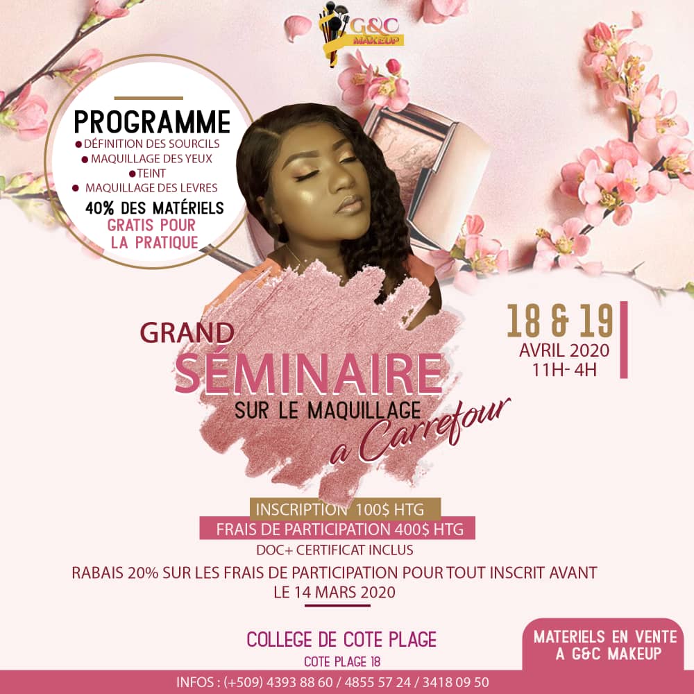 Il y aura un grand séminaire sur le maquillage à Collège de côte plage ,côte plage 18,carrefour. Le 18 au 19 avril 2019. Dans le programme,nous aurons les choses suivantes: définition des sourcils,maquillag...