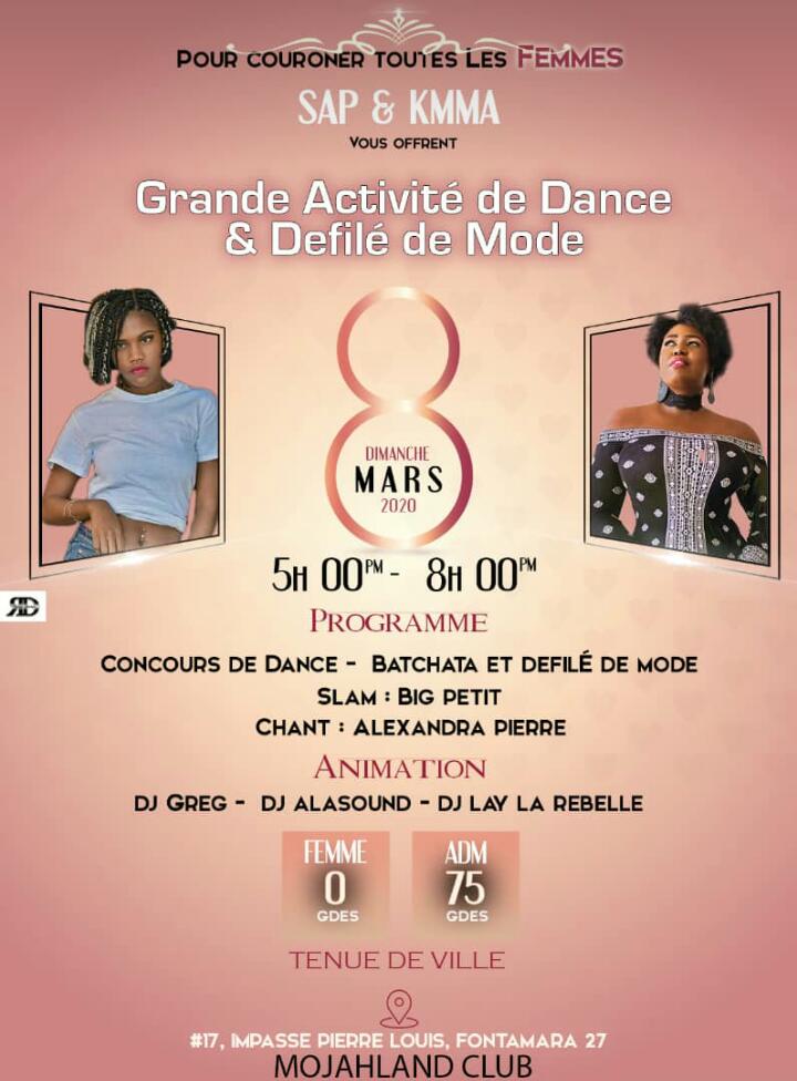 Pou jounen kap 8 mas la SAP & KMMA ap ofri nou on bel aktivite, ap gen dans,ap gen defile mòd. Big Petit ap slame epi nap gen Alexandra Pierre kap chante. Pou animasyon an nap genyen Dj greg, Dj alasound, Dj lay...