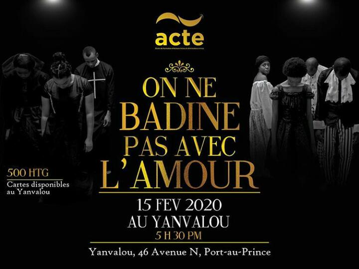 Acte présente "On ne badine pas avec l'amour" ce samedi 15 Février 2020 au Yanvalou à 5h30PM.Les cartes sont au prix de 500gdes.Passez prendre le vôtre au local de Yanvalou sis à 46,Avenue N,Port-au-Prince....