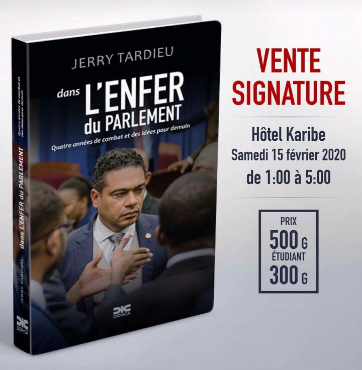 Le livre de Jerry Tardieu intitulé "dans L'ENFER du parlement" est prêt.Venez vous procurer votre plat littéraire le samedi 15 Février 2020 à l'Hôtel Karibe de 1hPM à 5hPM.Le prix du livre est à 500 gourd...