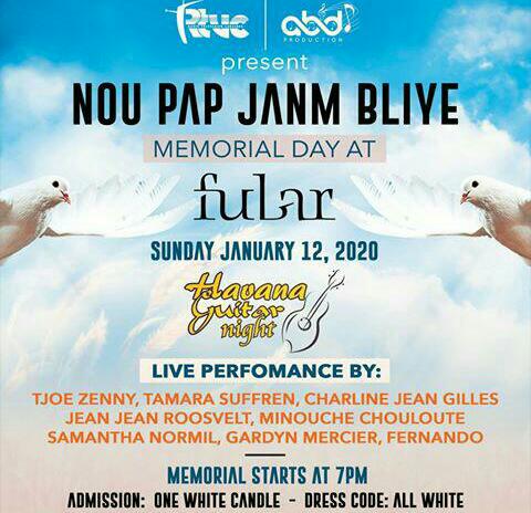 "nou pap janm bliye" se yon evenman kap pase nan Fubar 12 janvye a 7è Pm,ap gen anpil atis nou renmen tankou Tjoe zenny, Jean Jean Roosvelt, Charline Jean Gilles avek on bann lot anko. ADM:one white candle Dre...