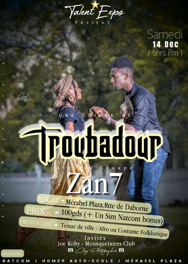 Talent Expo présente une soirée de Troubadour avec le groupe Zan7.Cette activité aura lieu le samedi 14 Déc 2019,à 5h PM,au local de Mérabel Plaza,Rte de Darbonne avec Joe Koby et Mousquetaires Club.Le prix...