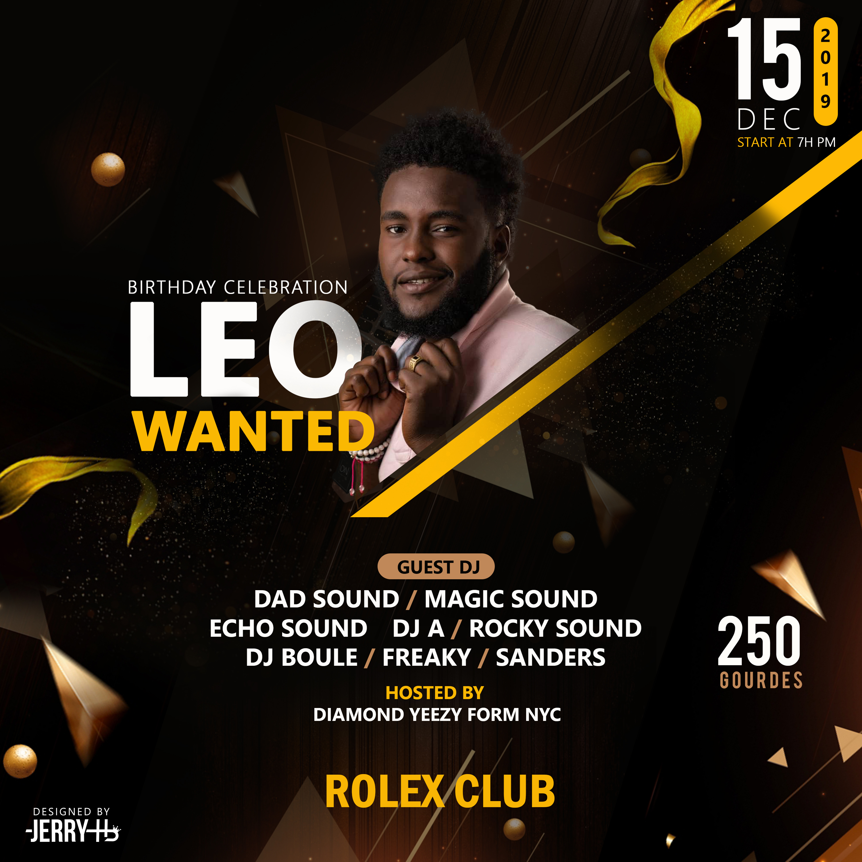 Venez fêter avec Leo Wanted le 15 Décembre 2019,à Rolex Club , à Carrefour. DAD SOUND , ROCKY SOUND , DJ SANDERS et DJ FREAKY seront de la partie.Le prix est à 250 gourdes....
