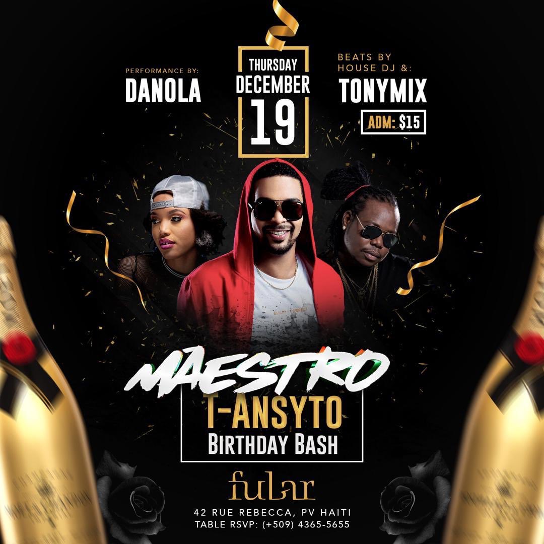 Venez fêter avec Maestro T-Ansyto le 19 Décembre 2019,à Fubar,sis à 42,Rue Rebecca,Pétion-Ville.Danola et Tonymix seront de la partie.Le prix est à $15.Pour réservation,contactez-le:+509 4365-5655....