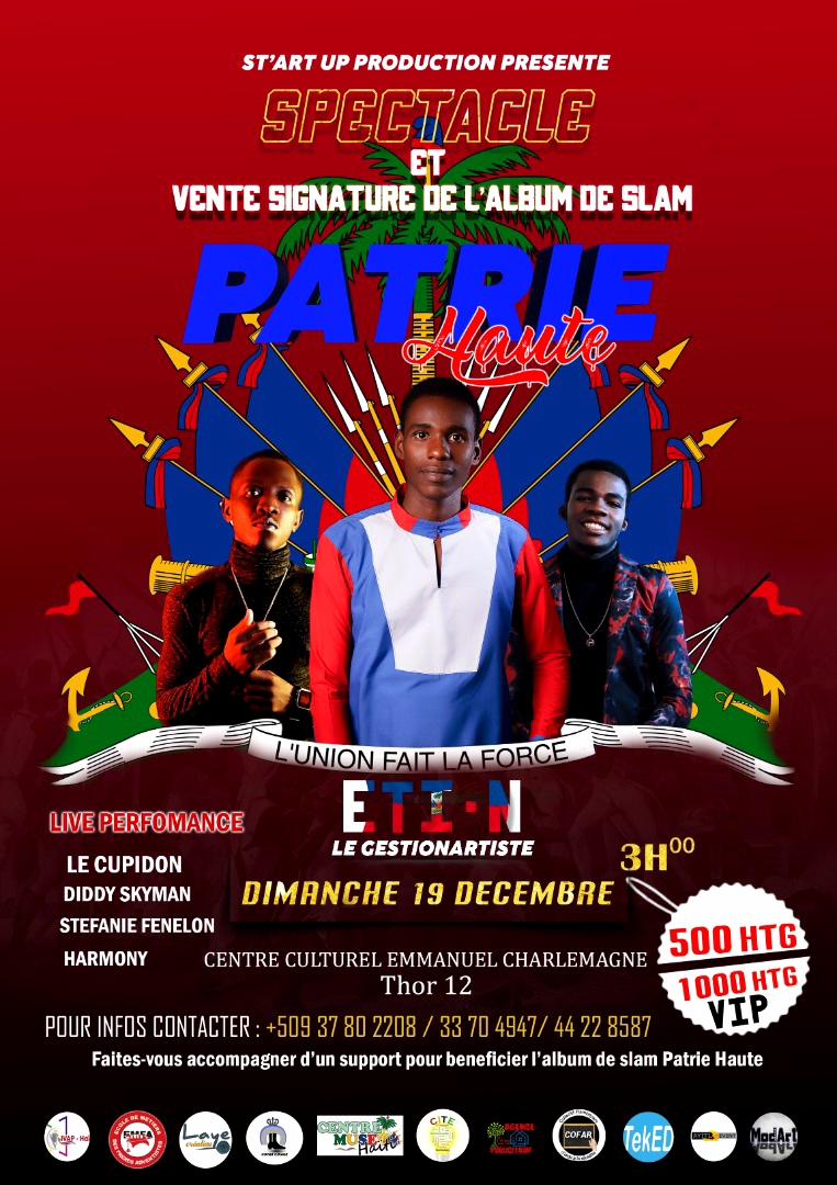 Spéctacle et vente signature de l'album de slam "Patrie Haute". Ce spectacle ainsi que cet album de slam a pour objectif de proumouvoir l'amour de la patrie tout en appelant chaque haïtien à s'engager l'avance...