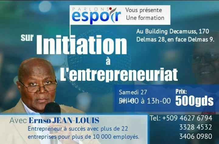 Parlons Espoir vous offre une formation sur l'initiation à l'entrepreneuriat avec Ersno JEAN-LOUIS,un entrepreneur à succès,le samedi 27 Juillet 2019,de 9H à 13H.Cette formation se fera au Building Decamus si...