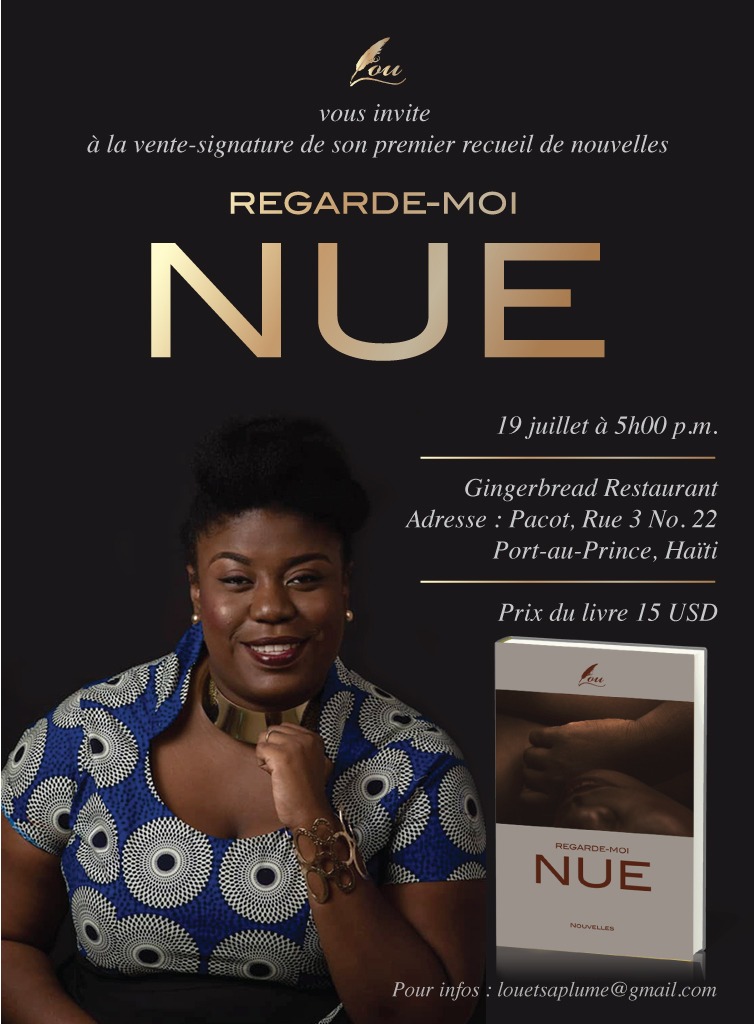Vous êtes invités à la vente-signature du premier recueil de nouvelles de Lou titré "Regarde-moi nue",le 19 Juillet 2019 à 5h PM,à Gingerbread Restaurant sis à 22,Rue 3,Pacot,Port-au-Prince,Haïti.Le livre...