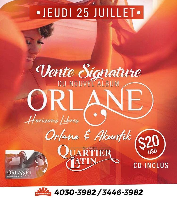 La vente signature de l'album d'Orlane titré "Horizons Libres" se fera le Jeudi 25 Juillet 2019 à Quartier Latin au prix de $20 US avec CD inclus.Il y aura la performance live de Orlane et Akoustik.Pour plus d'...