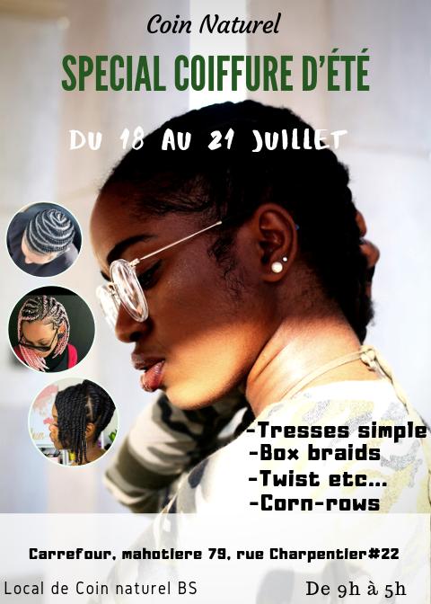 Afin de permettre à vos cheveux de mieux jouir l'été, Coin Naturel vous présente un long week-end de réduction sur toutes nos coiffures protectrices du 18 au 21 juillet. Êtes-vous corn-rows ou box braid...
