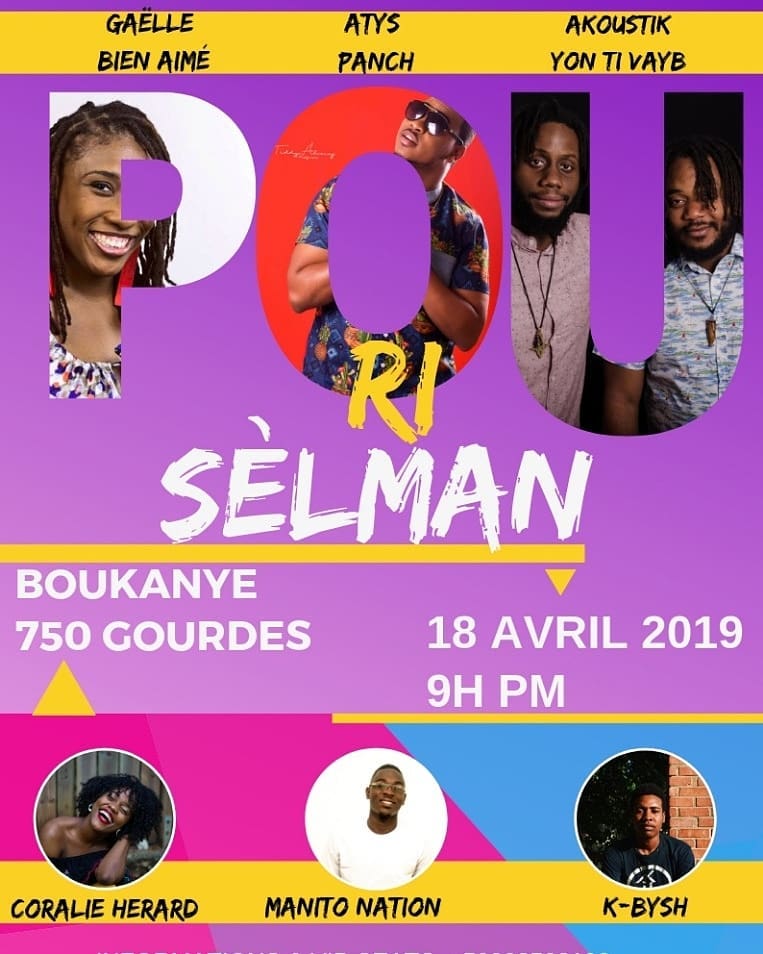 Centre Impact nous présente "Pou Ri Selman" avec l'humoriste Gaelle Bien-Aimé qui sera là pour continuer à faire tordre de rire son public ,le 18 Avril 2019,à "Boukanye",au Cap Haïtien.L'activité est au pr...