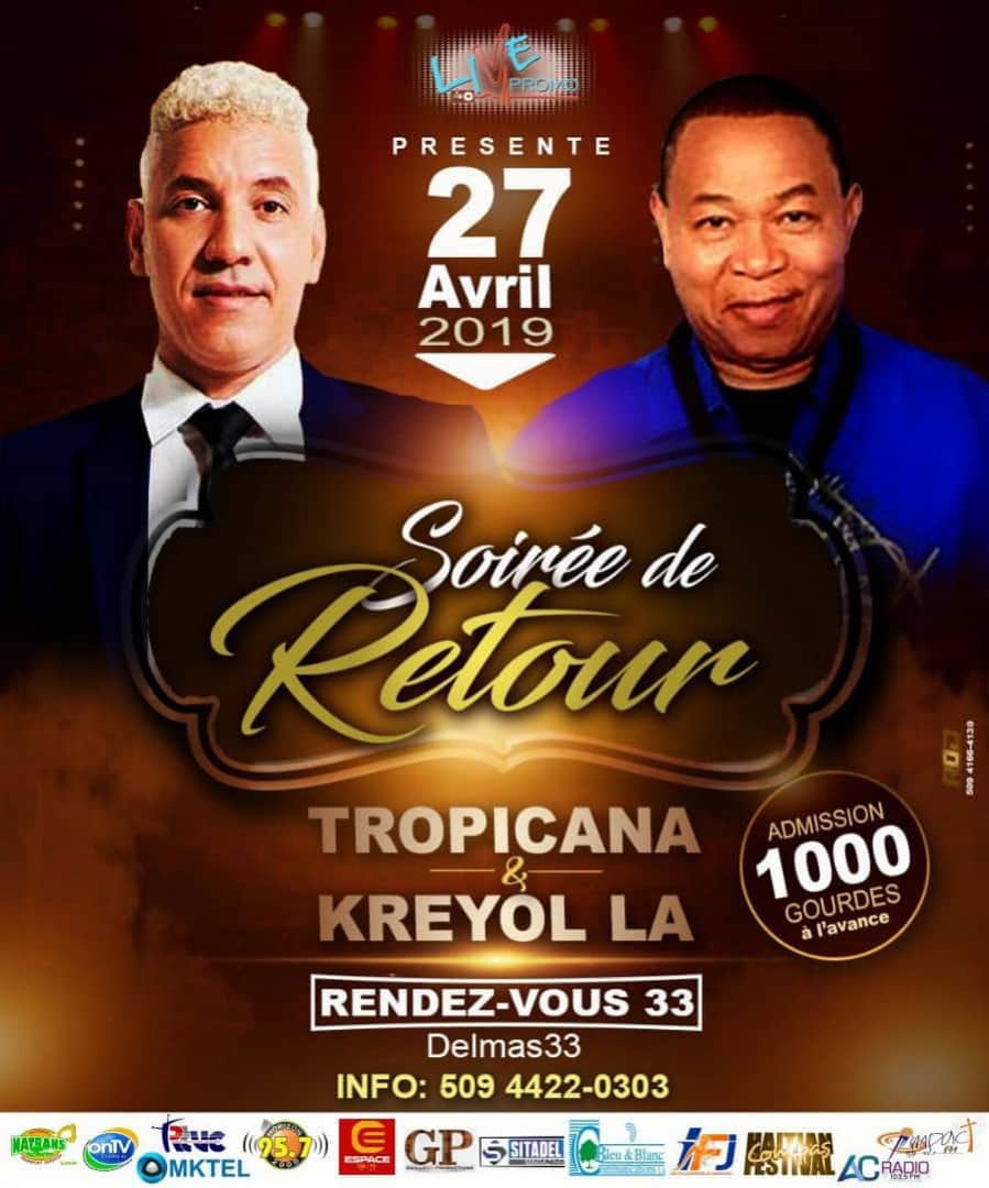 LIVE Promo présente le 27 Avril 2019,à Rendez-Vous 33 sis à Delmas 33, une soirée nommée "Soirée de Retour" avec deux des célèbres groupes qui ont marqué l'histoire musicale d'Haïti: TROPICANA et KREYOL...