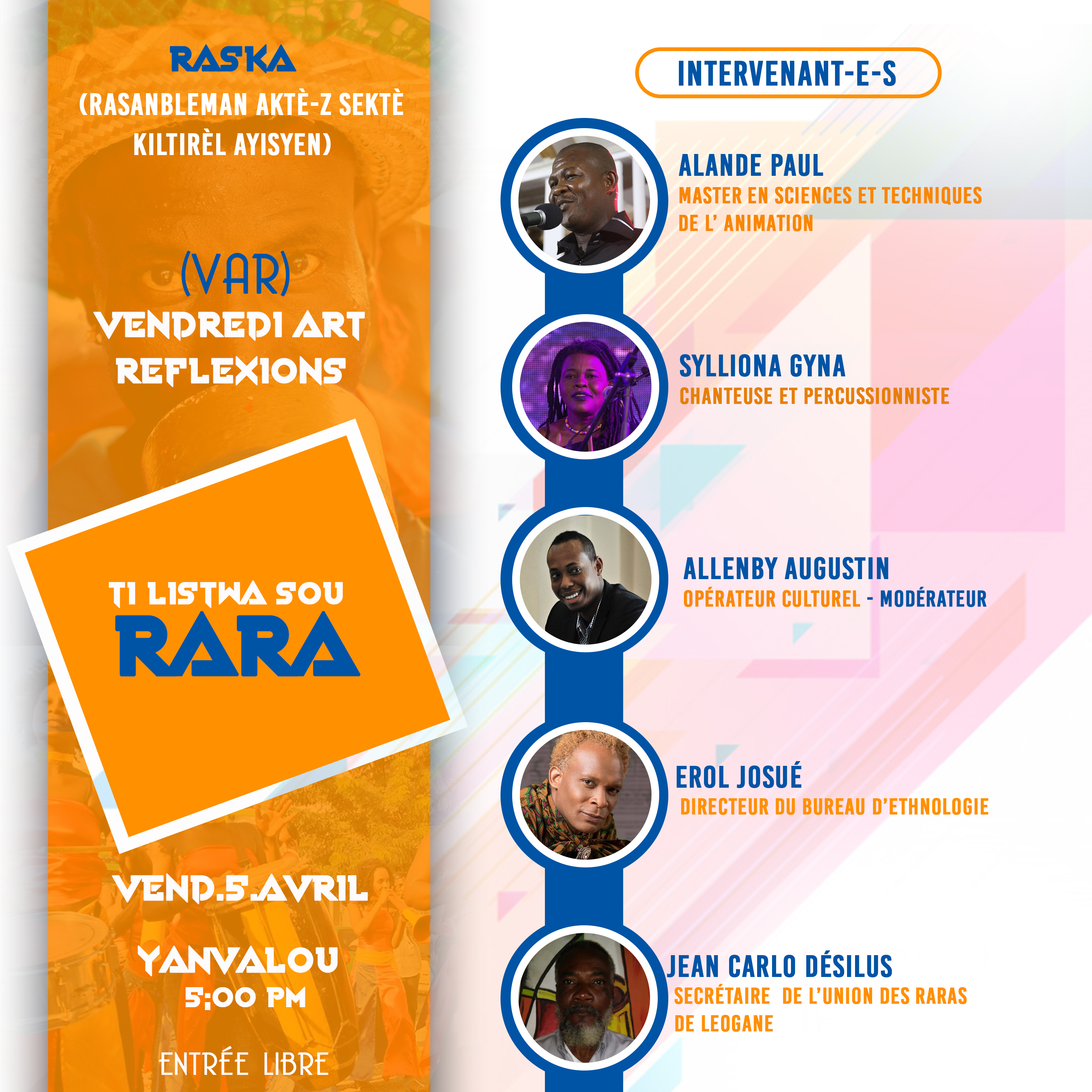 Le groupe RASKA(Rasanbleman Aktè-z Sektè Kiltirèl Ayisyen) nous présente chaque mois "Vendredi Art Réflexions(VAR)",une conférence concertant le domaine culturel haïtien.Pour ce mois-ci,le thème à débat...