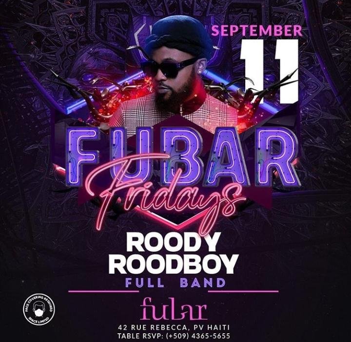 Venez passer un bon moment à Fubar Fridays avec Roody Roodboy le 11 Septembre 2020.Pour réserver,contactez le: +509 4365-5655.N'oubliez pas votre masque....