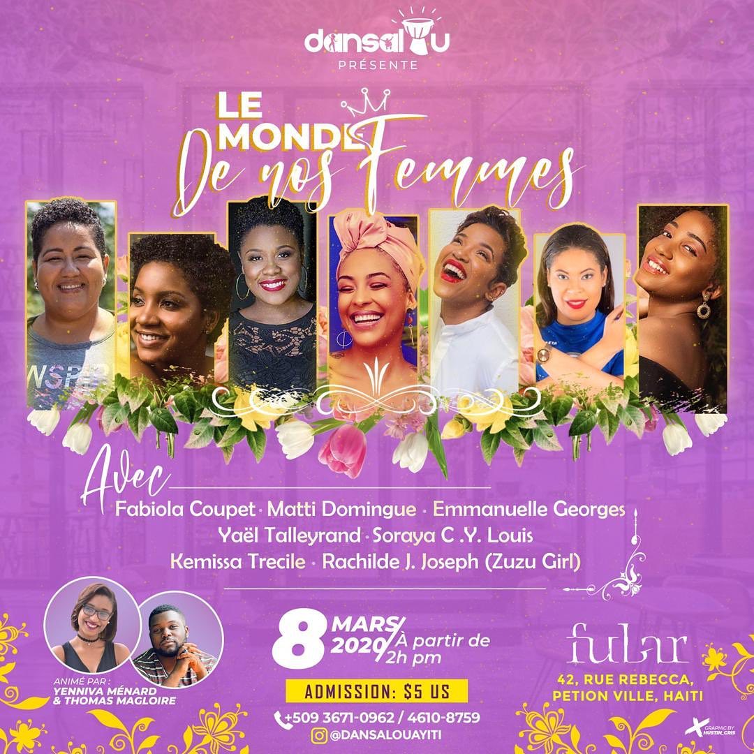 À l'occasion de la journée internationale des droits de la femme,Dansalou vous invite à leur activité intitulé "Le monde de nos femmes" avec la participation de Fabiola Coupet,Matti Domingue,Emmanuella Georg...