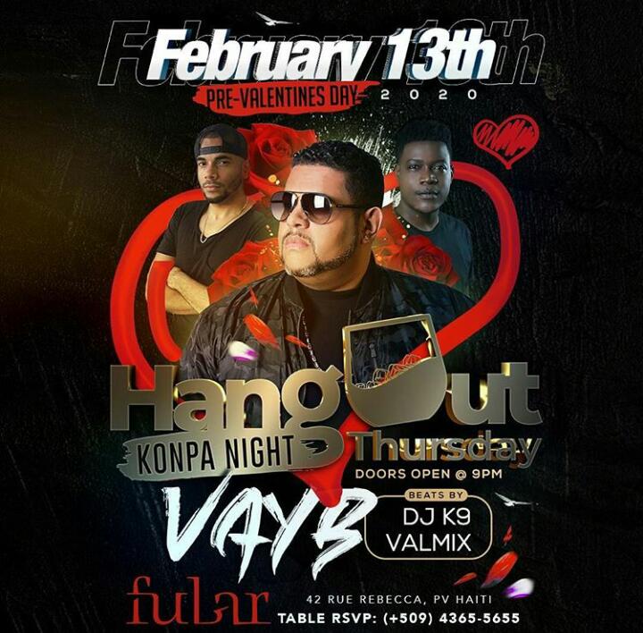 Vous êtes invités au Hangout Thursday à Fubar sis à 42,Rue Rebecca,Pétion-Ville.le jeudi 13 février 2020,à partir de 9hPM.Ce sera un Konpa Night avec Vayb,DjK9 et Valmix.Pour réservez votre table,contact...