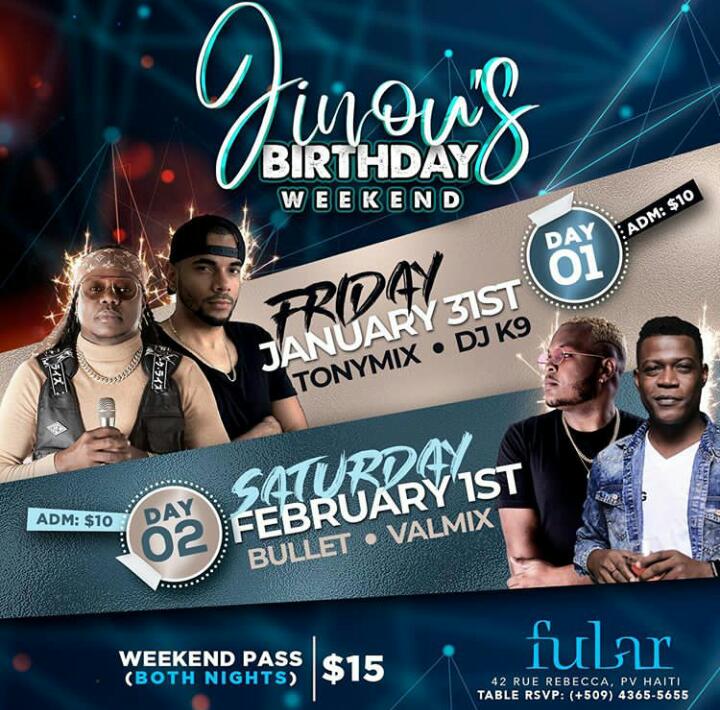 Siw pase on semaine fatig weekend lan pa oblije konsa, se pou sa nap envitew nan Jinou's birthday pou weekend sa,lap fet nan fubar,nap genyen Tonymix,Dj k9 nan vandredi epi Bullet ak Valmix nan samdi. Pa rate bel...