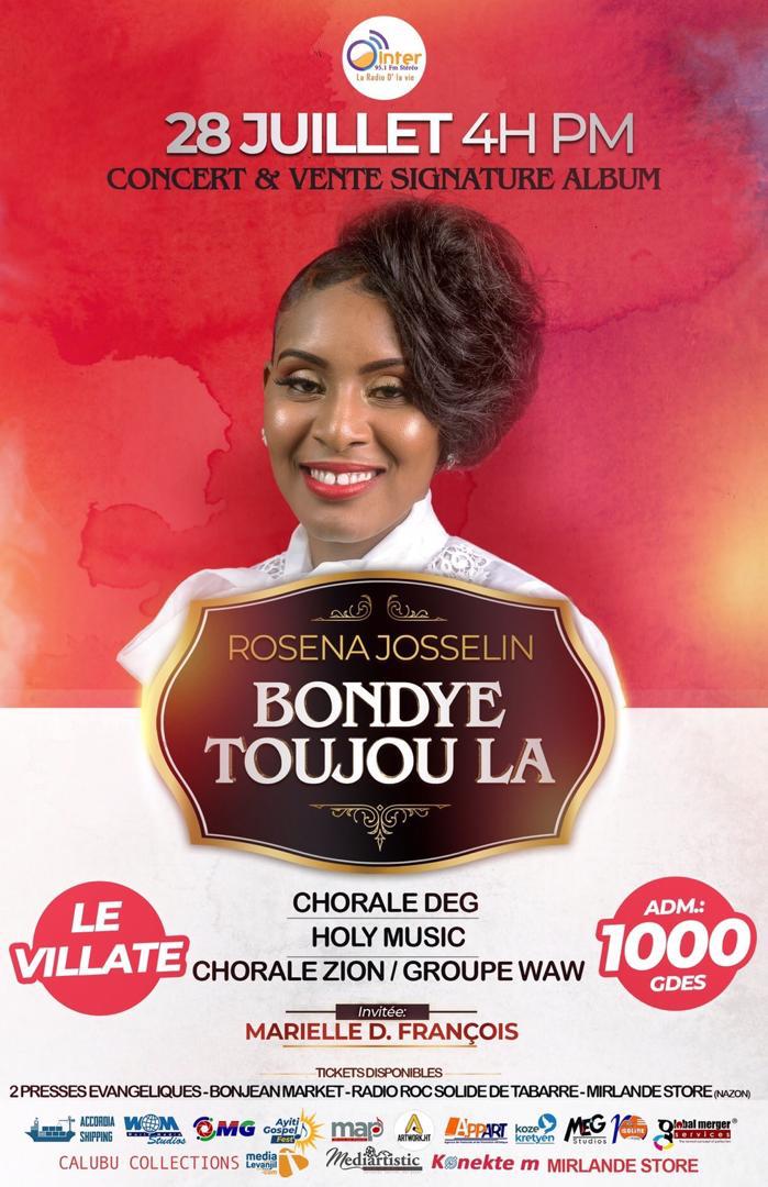 Vous êtes invités au concert et à la vente signature de l'album "Bondye toujou la" de Rosena Josselin le 28 Juillet 2019,à 4h PM,à Le Villate.Les groupes invités sont:Chorale DEG,Holy Music,Chorale Zion,Gro...