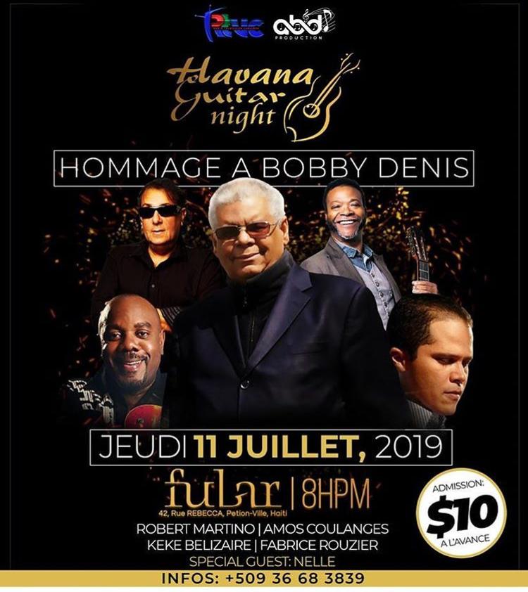 Le Jeudi 11 Juillet 2019 ,Havana Guitar décide de rendre hommage à Bobby Denis,à Fubar sis à 42,Rue Rebecca,Pétion-Ville,à partir de 20h.Les artistes qui seront présents seront:Robert Martino,Amos Coulange...