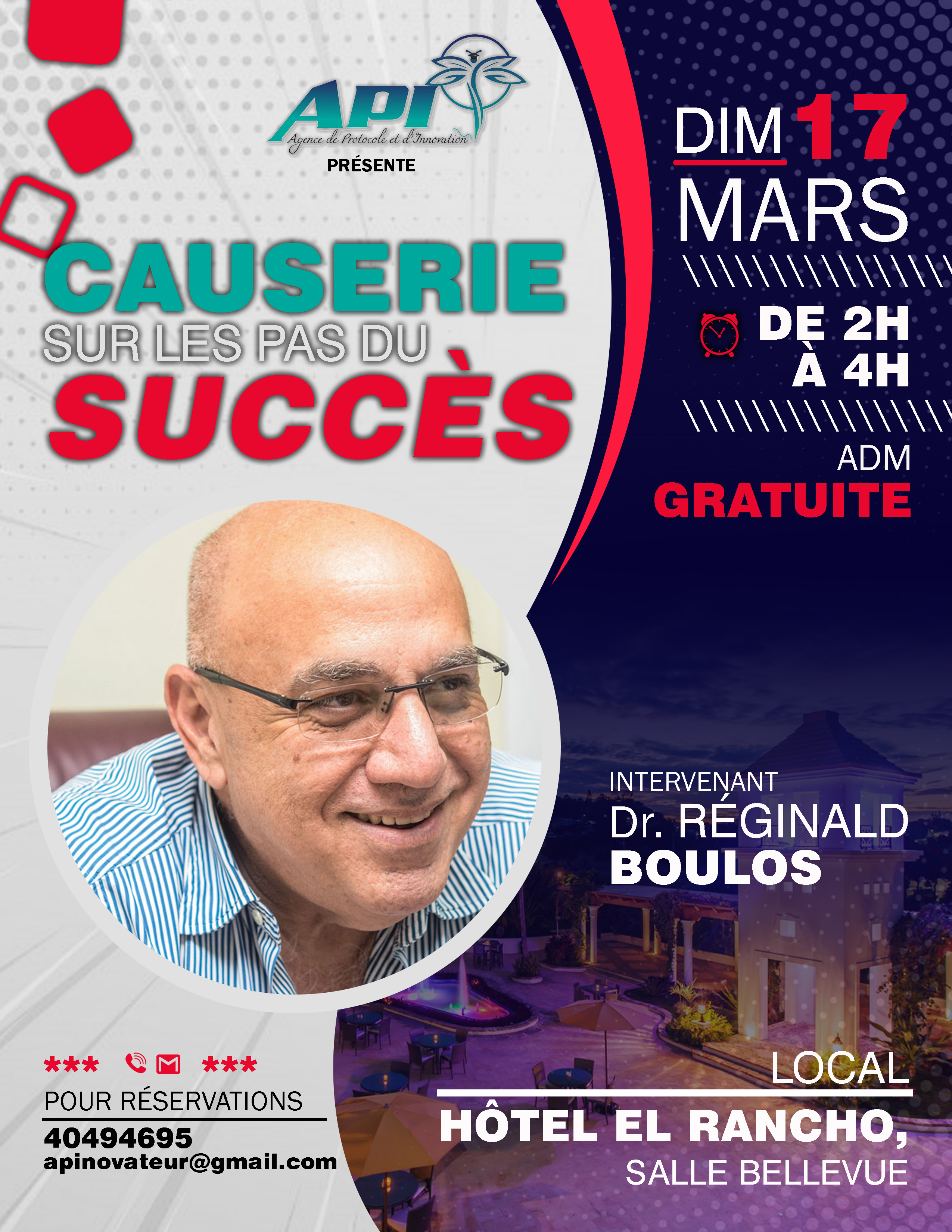 Réginald Boulos, l'homme d'affaires à succès qui a trouvé le chemin de la réussite sur la terre glissante d'Haïti sera à l'hôtel El RANCHO pour une causerie autour du thème "sur les pas du succès". L'ad...